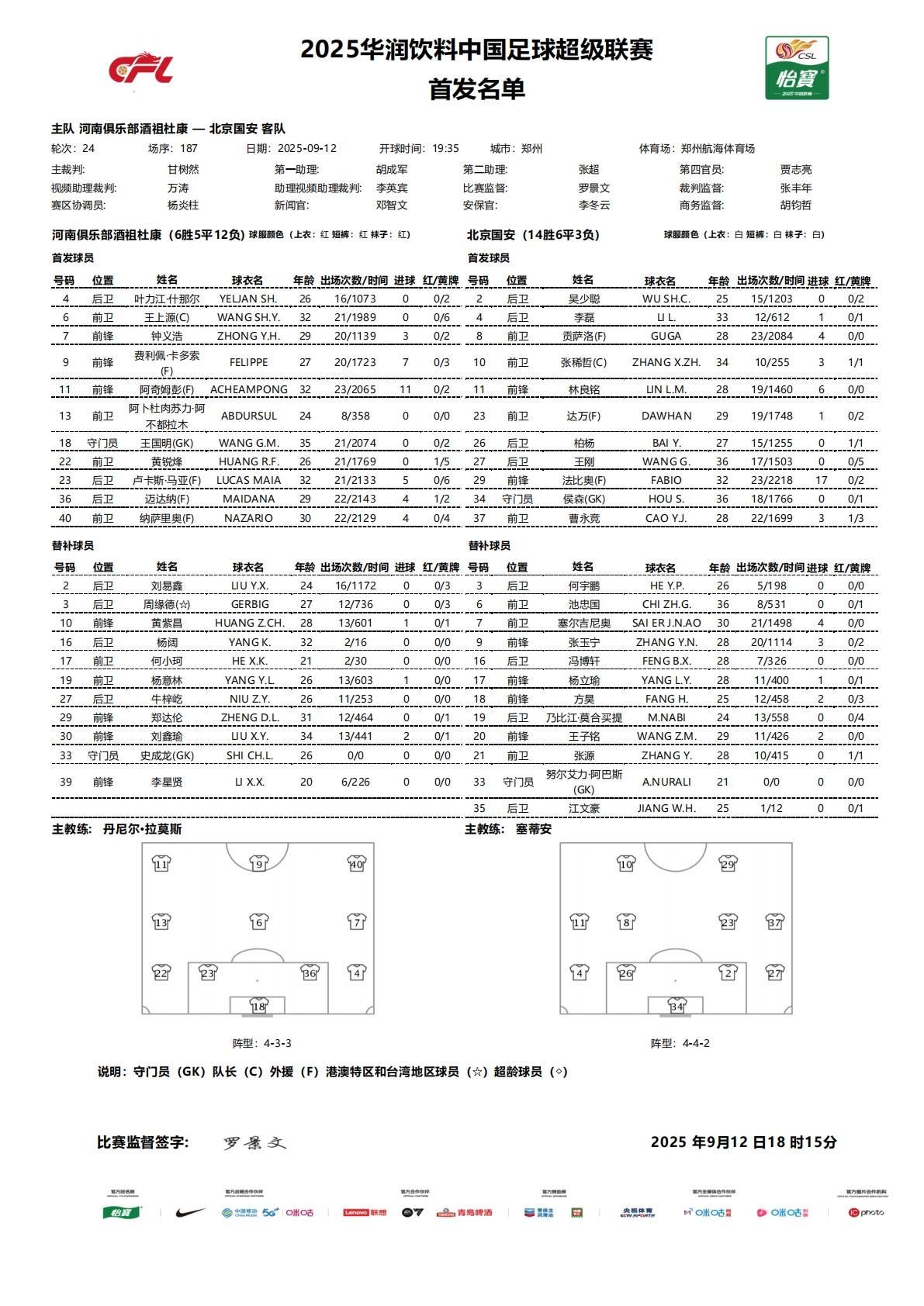 北京时间9月12日19:35,中超第24轮继续进行,河南队主场迎战北京国安,赛前双方首发阵容公布: